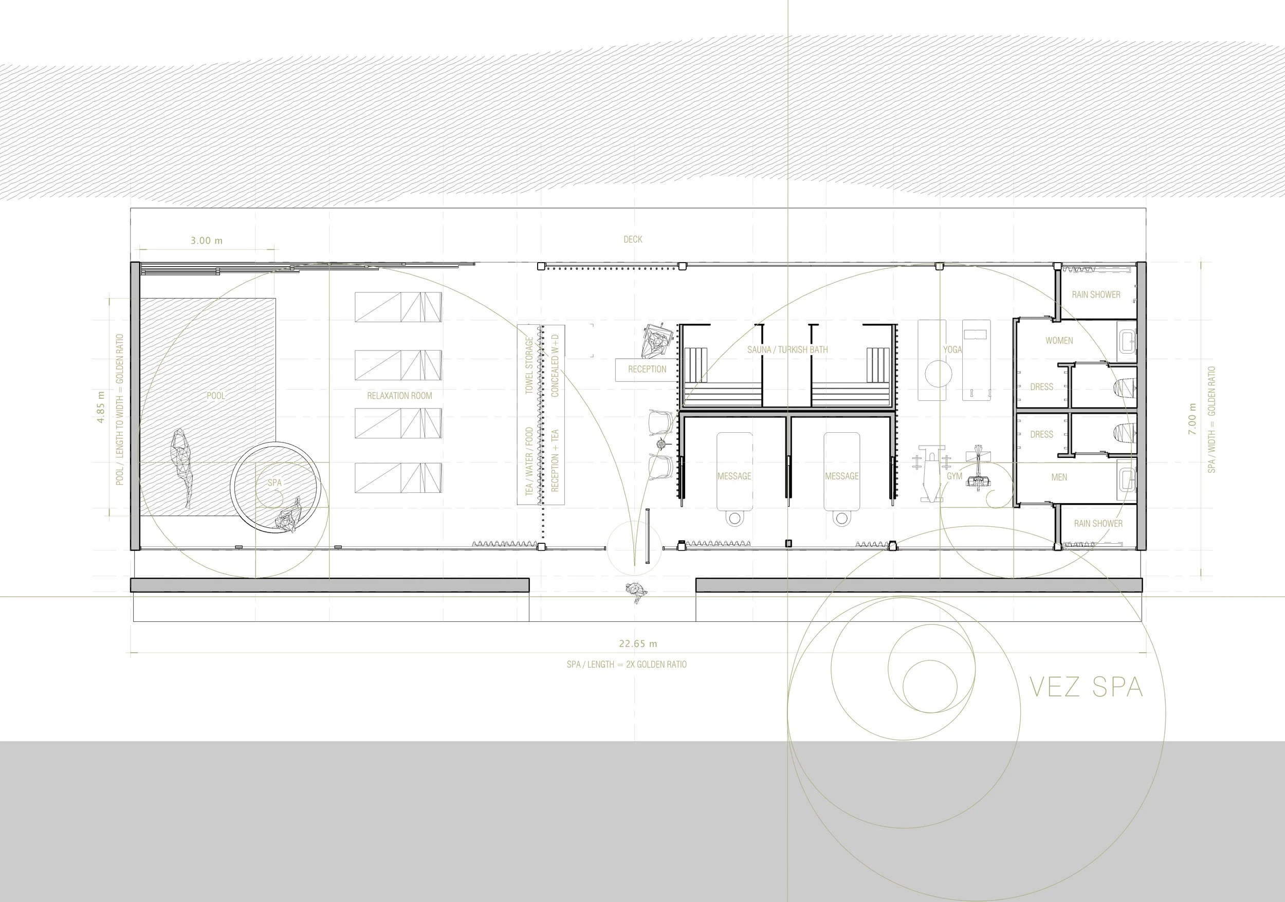 The design of this spa is rooted in the principles of dynamic symmetry, guided by the Golden Ratio and expressed through a double Fibonacci spiral. This sacred geometry serves not only as an aesthetic foundation but also as a way to reflect the natural harmony of the surrounding environment.